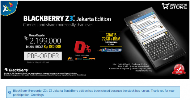 Z3. Ngoài 2 nhà mạng Indosat và XL thì hàng loạt các trang bán hàng trực tuyến của Indonesia cũng cho khách hàng đặt trước. Tuy nhiên, chỉ sau 1 ngày, hầu như lượng BlackBerry Z3 dành cho họ đã được đặt mua hết (sold out - '