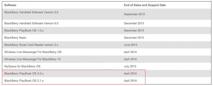 Theo trang web "Software Support Life Cycle" của BlackBerry, cả hai hệ điều hành dành cho PlayBook là OS OS 2.0.x và OS 2.1.x sẽ "End Of Life" (EOL) tháng 4 này. Trước đây, HĐH PlayBook OS 1.0.x đã EOL vào tháng 12 năm 2013.