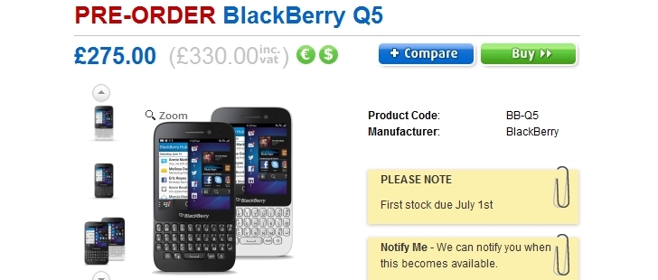 Tuần trước chúng ta đã biết tin tại Anh, Unlocked-Mobiles cho đặt trước BlackBerry Q5 bản SIM Free với giá 350£, giao hàng vào 15/07. Và hôm nay, Clove - một nhà bán lẻ khác của Anh cũng cho phép khách hàng đặt trước