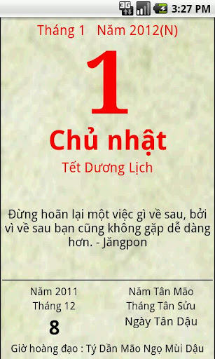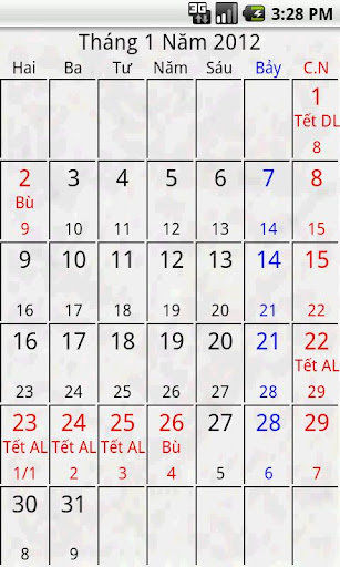 Ứng dụng để xem lịch dương, lịch âm theo lịch ngày, lịch tháng hoặc lịch năm. Bạn có thể xem ngày lễ (ngày lịch đỏ), kể cả ngày nghỉ bù từ năm 2005 đến năm 2010.