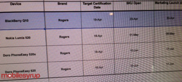 <div style="text-align: justify !important;">Như chúng ta đã biết thì các thiết bị BlackBerry Q10 sẽ được bán ra vào cuối tháng này nhưng thời gian cụ thể thì chưa rõ ràng. Nhưng mới đây một hình ảnh rò rỉ đã cho thấy BlackBerry Q10 sẽ được bán ra tại Canada thông qua nhà mạng Rogers vào ngày 30/4. Giá bán của nó vẫn chưa được đề cập.