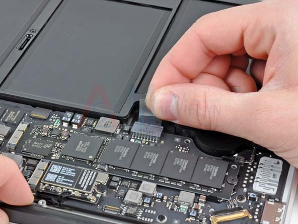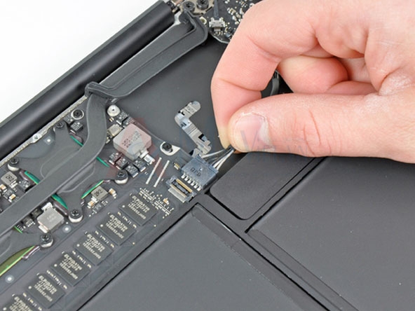 - Chú ý : Chắc chắn bạn đang lật nắp chắn có bản lề , không phải là giắc cắm trực tiếp. Kéo cáp trackpad thẳng ra khỏi vị trí về phía trước máy.