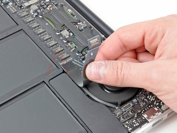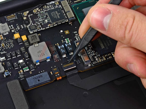- Sử dụng đầu của công cụ hỗ trọ hoặc móng tay của bạn để lật lên nắp giữ cáp trackpad ( ổ cắm cáp ZIF) .
