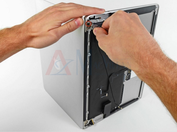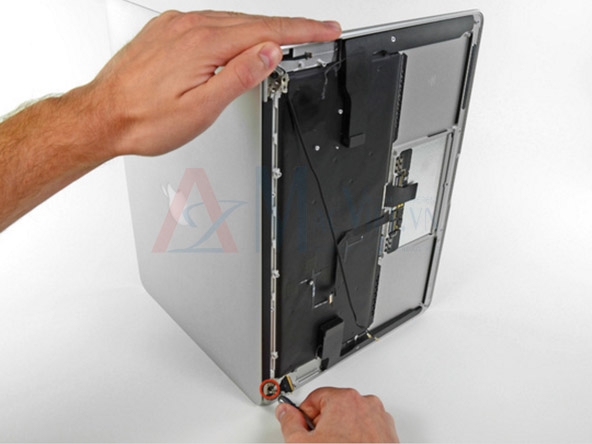 Trước khi tháo vít khung màn hình còn lại , cần chắc chắn đã cố định và đều tay với bên kia trách trường hợp Macbook có thể bị rơi xuống mặt bàn gây vỡ . Linh kiện thay thế cho Macbook rất tốn kém nên cần sự chỉnh chu trong quá trình thay thế