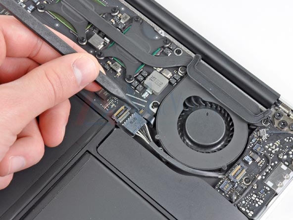 Sử dụng đầu thanh nhựa để cẩn thận lật nắp chắn cáp kết nối với quạt Fan