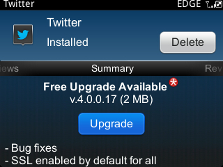 Twitter for BlackBerry vừa nhận được bản cập nhật v4.0.0.17 trên BlackBerry World. Trong bản cập nhật nhỏ này, BlackBerry chỉ sửa một vài lỗi nhỏ và tăng cường thêm bảo mật.