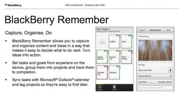 [align=justify]Một vài hình ảnh rò rỉ mới đây cho thấy cái nhìn đầu tiên về BlackBerry Remember trên BlackBerry 10. Ứng dụng Remember sẽ giúp bạn quản lý công việc tốt hơn trên BlackBerry 10 và sẽ tốt hôn nếu nó tích hợp thêm third party app như Evernote. BlackBerry Remember chophép bạn: