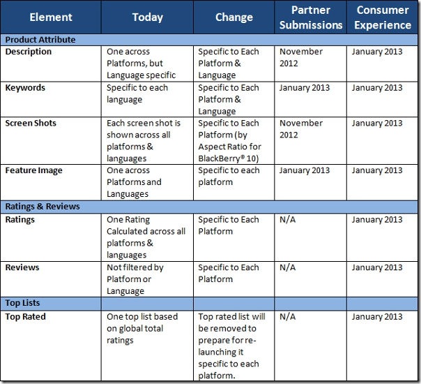 Ngoài ra RIM còn thêm các hình ảnh đặc trưng riêng, ảnh chụp màn hình (screenshots), và đánh giá/xếp hạng (reviews/ratings) cho mỗi nền tảng để bạn có thể xem xét và các đánh gía chỉ dành riêng cho nền tảng của bạn. RIM cũng đưa ra nhiều từ khóa tích hợp tốt hơn và hỗ trợ đa ngôn ngữ.